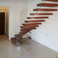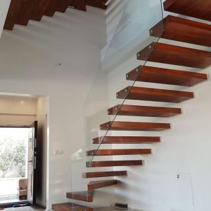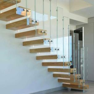 پله معلق پیش ساخته چوبی با هندریل شیشه ای در دو طبقه