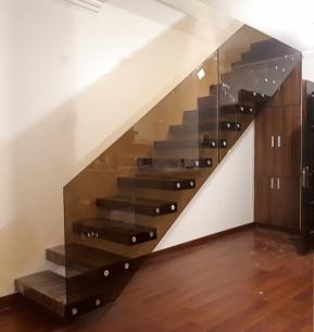 پله معلق راستا چوب راش با نرده شیشه ای برنز